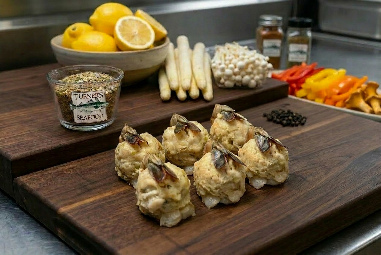 Raw U-15 wild shrimp from the Sea of Cortez, stuffed with a vegetable, seafood stuffing. Served with 4oz lobster basil cream sauce per 6 shrimp.
