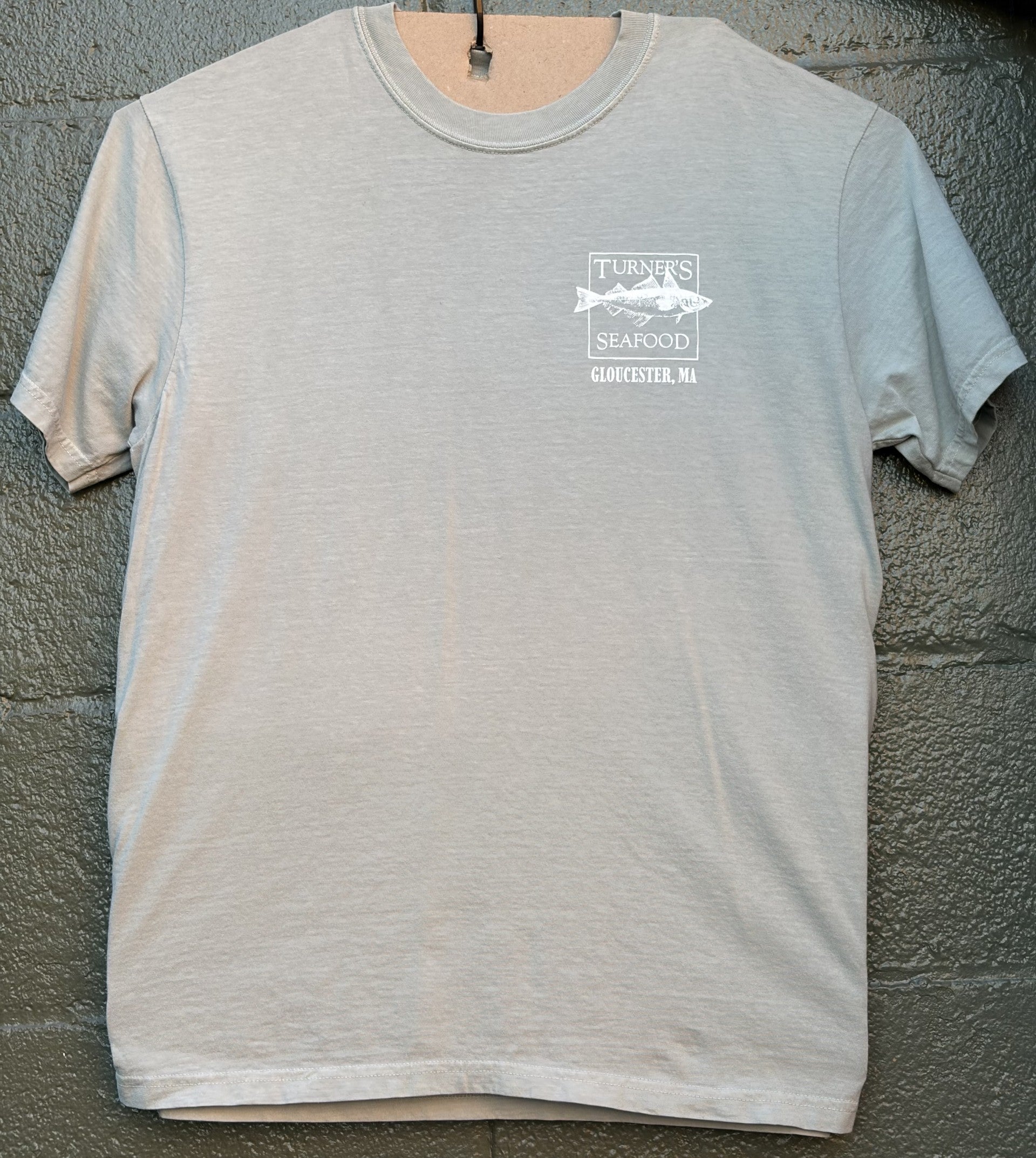 A comfort colors Turner's Seafood Gloucester exclusive t-shirt with a caricature drawing of our storefront in America's oldest fishing port.